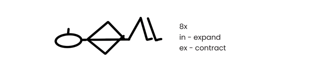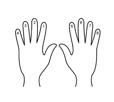 Observe 8 slow, comfortable breaths with intentional expansion and contraction of the muscles that support your breathing. Count the breaths on the fingers of both hands.